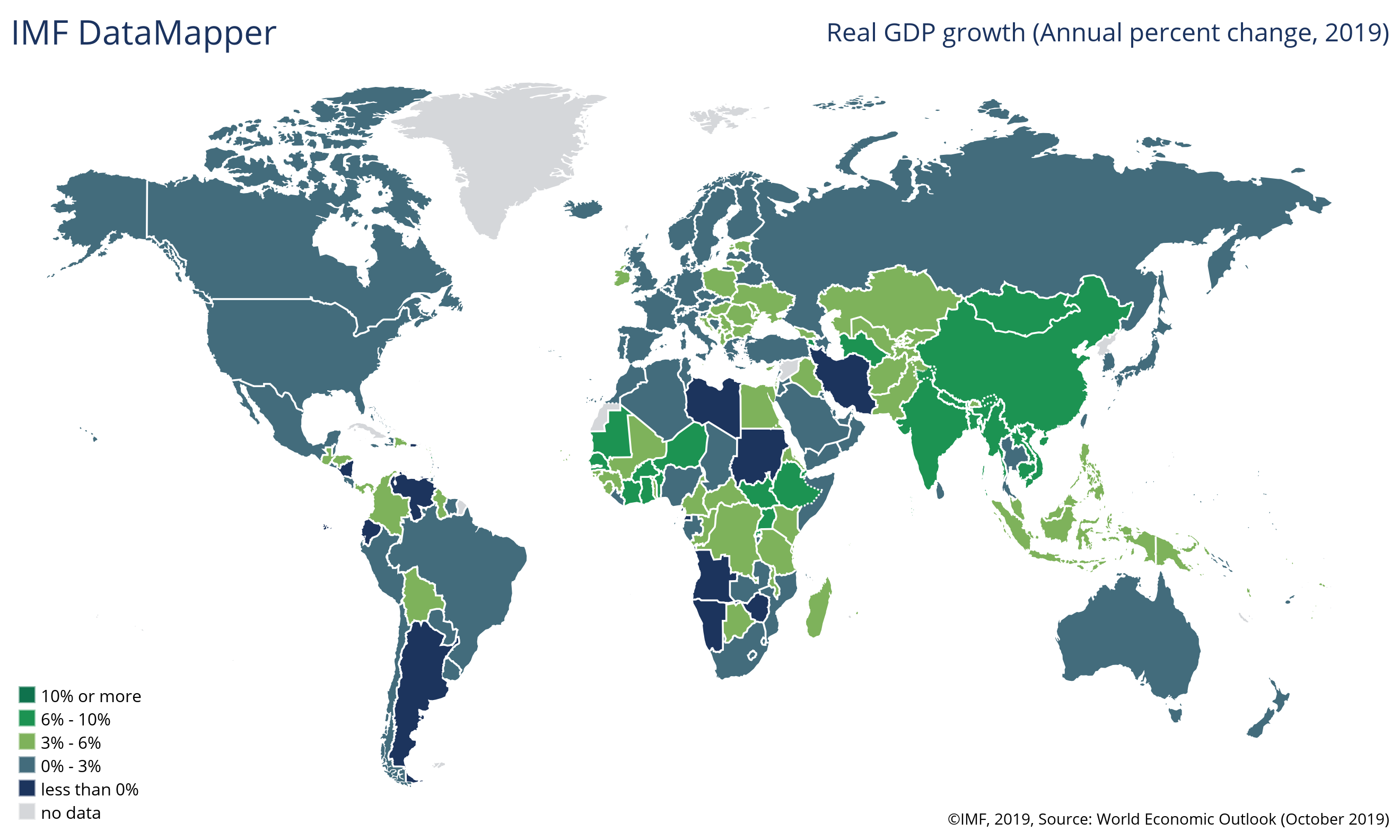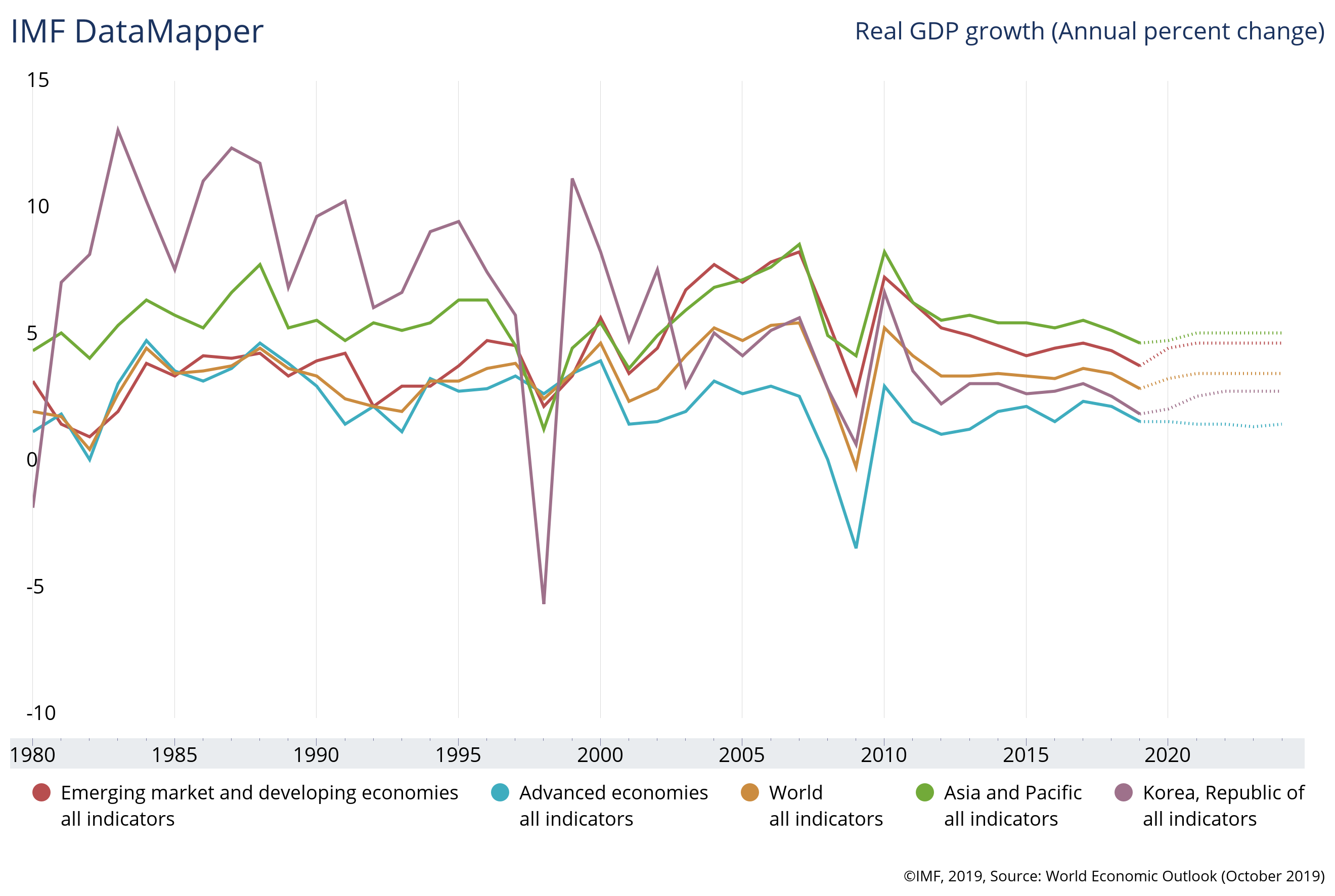 오늘(10/16) IMF는 세게 경제 성장률(3%)을 발표하며 한국의 경제 성장률 조정치도 발표했습니다. 한국은 무려 0.6%나 낮아진 2.0%을 제시했습니다. 아래 IMF DataMaper의 차트를 보면 한국의 경제 성장률이 1997년 외환위기에 큰 폭의 변동성을 가진 후 2003년 이후로 세계 경제성장률 지표와 유사해지더니 하회하는 것을 볼 수 있습니다. 경제가 일정 규모로 성장해 선진국 대열에 합류하게 되면 성장률이 낮아지며 정체되는 것이 당연합니다. 하지만 예상 경제성장률이 지속적으로, 그리고 이번에 대폭 하향 조정된 점이 마음을 무겁게 합니다.