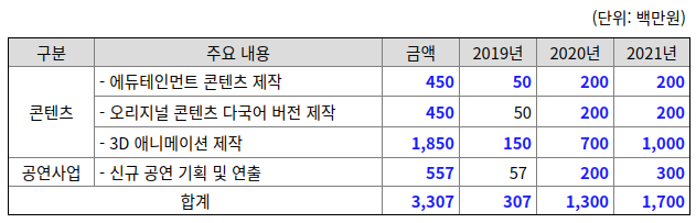 운영자금 사용계획입니다. 3D 애니메이션 제작에 큰 비중을 두고 있습니다. 상대적으로 신규사업 투자 금액은 미미합니다.