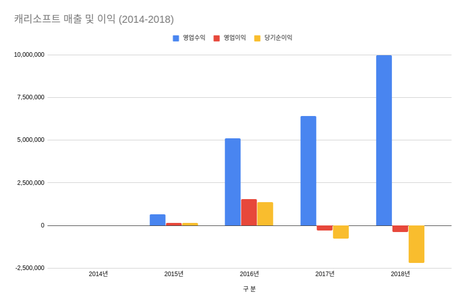 9,000원에 성공적으로 상장한다면 순수입금이 약 61.9억입니다. 캐리소프트는 아래와 같은 항목에 비용을 지출할 것이며 아시아 글로벌 콘텐츠 기업으로 성장하기 위한 기틀을 마련한다고 합니다. 뭔가 초기 스타트업들이 VC나 정부사업에 제출할 때 내는 사업계획서의 문구를 보는 것 같습니다. 개인적으론 좀 허황된 느낌입니다. 이런 이야기를 하려면 미래 매출과 이익이 성장할 거란 예측 그래프 말고 과거 매출과 이익이 성장해오고 있는 그래프를 내밀고 해야 할 것 같습니다.