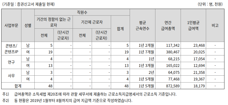 개인적으로 이런 상장에 대해 별로 좋게 생각하지 않습니다. 기업의 성장성에 논란이 있을 수 있고 조달 자금이 기업의 미래 성장 가치에 주는 영향보다 대주주 지분 현금화에 주는 영향이 더 크다고 보기 때문입니다. 콘텐츠를 만드는 기업의 평균 급여가 최저 임금보다 못하다는 것도 충격입니다. 인건비를 이 정도 수준으로 줄이고 있는데 회사는 2년째 적자이고요. 최악의 경우 보호예수가 종료된 이후 대주주 지분 감소와 함께 상장폐지까지 간다면 정작 피해는 개인 투자자가 고스란히 떠안아야 할 수 있습니다.