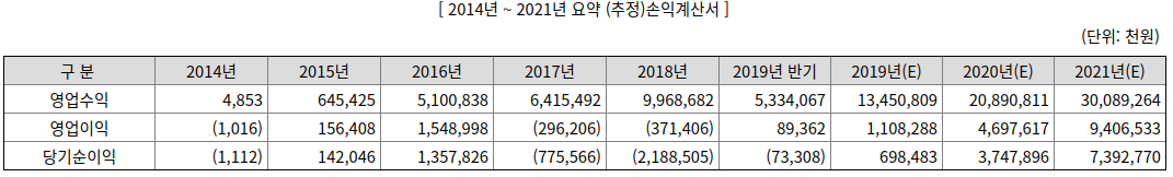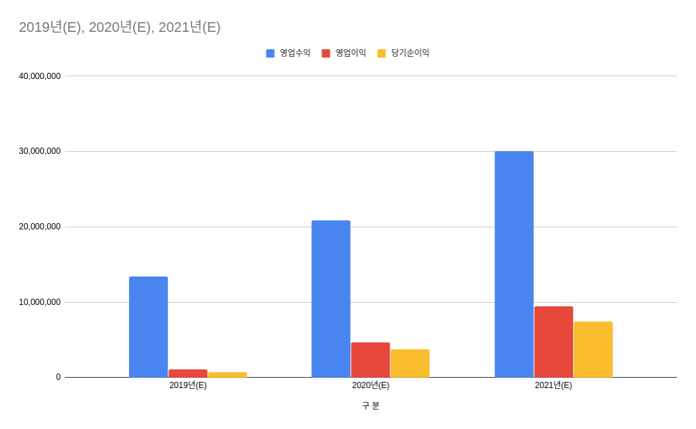 2016년 급성장 이후 2017년부터 이익이 꺾이기 시작했습니다. 2017년은 원조 캐리 언니 강혜진 씨가 퇴사하고 캐리소프트가 라인업을 재정비하던 시기와 일치하네요. 2018년 당기순이익을 보겠습니다. 무려 21억 적자를 봤습니다. 아래는 IPO이후 예상 매출과 이익인데 누구나 꿈꾸는 J커브 성장 그래프와 상당히 유사합니다. 과거 매출, 이익과 굉장히 대조되는 예상치인데 말 그대로 예상치이니 뭐라고 할 순 없을 것 같습니다. 추정치가 허황되다고 생각되면 투자하지 않으면 됩니다.