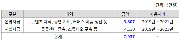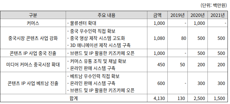 운영자금 사용계획입니다. 3D 애니메이션 제작에 큰 비중을 두고 있습니다. 상대적으로 신규사업 투자 금액은 미미합니다.