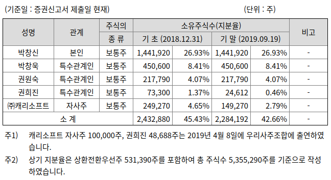 박창신은 권원숙의 남편으로 현 캐리소프트 대표이사입니다. 권원숙은 박창신의 부인으로 초기 대표이사였습니다. 박창욱은 박창신 대표이사의 동생입니다. 권희진은 특수관계인이나 가족 관계 여부가 확실치 않습니다. 이렇게 해서 가진 지분이 39.87%입니다. 권희진은 특수관계인이나 가족관계 여부를 확인할 수 없으니 제외하고 보면 가족이 소유한 지분이 39.41%입니다.