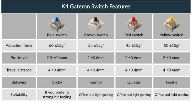 적축 -> 청축 -> 갈축 -> 황축 순으로 인기가 있었습니다. 아래 K4 Gateron Switch Features 표를 보면 각 축의 특징을 알 수 있는데요. 참고로 흔히 기계식 키보드하면 가장 먼저 떠오르는 짤깍짤깍 하는 소리의 시끄러운 키보드는 청축을 사용하고 있습니다. 적축은 가장 키압이 낮고 조용(Quieter Behavior)하네요. 황축은 적축과 갈축의 중간 정도인 것 같습니다.