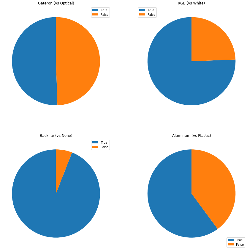 키보드의 백라이트를 포함할 것인지, 백라이트를 RGB로 할 것인지 그냥 White로 할 것인지, 알루미늄을 선택할 것인지 등의 옵션이 더 있었습니다. 주요 관심은 스위치와 축의 인기도였기 때문에 나머지 옵션들은 간단히 Seaborn의 FaceGrid를 통해 살펴보고 마치겠습니다.