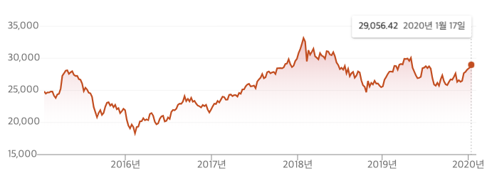 사이드카 발동 이후 한국 증시는 꾸준히 상승 시도를 했지만 언제 터질지 모르는 악재 속에 늘 불안정한 움직임을 보였습니다. 자고 일어나면 생각치도 않은 사건이 터져 있었으니까요. 트럼프 대통령은 "설마 그렇게 하겠어"라는 의심을 대부분 확신으로 돌려줬습니다. 개미 투자자들이 세계 정치나 경제 상황에 이렇게 관심이 많았던 적도 드물지 않았나 생각합니다. 지난 3년 간 미국, 일본, 한국, 중국의 지수는 어떻게 변했을까요. 아래는 최근 5년간 지수 차트입니다. 보시는 바와 같이 미국 나스닥은 사상 최고가를 연일 갈아치우고 있고 일본 닛케이는 전고점 회복 직전입니다. 안타깝게도 우리나라 지수는 5년 전 가격 근처 등락을 보이며 방향을 정하지 못하고 있습니다.