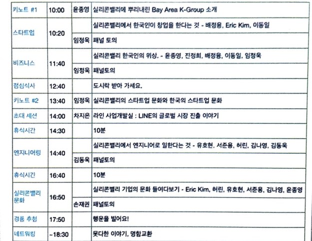 스타트업 세션에서는 각 회사마다 시작부터 끝까지 준비하고 겪었던 일들을 큰 흐름을 보기가 어려웠다. 그래서 지금까지 어떤 재무상태를 가지고 있고, 어떤 비전이 있는지(무엇이 차별화되는 핵심 요소인지), 생각대로 돈은 잘 벌리고 있는지(이건 스타트업을 얼마나 유지할 수 있을 것인지와 관련이 있으므로), 실리콘밸리라는 다소 불편할 수 있는 환경에서 현재 어떻게 끌어가고 있으며 무엇이 고민인지 이런 내용들이 친구에게 이야기하듯 말해지지 않고 발표라는 것으로 한 꺼풀 덮여있는 느낌이어서 궁금증이 말끔히 해소되지 않았다.