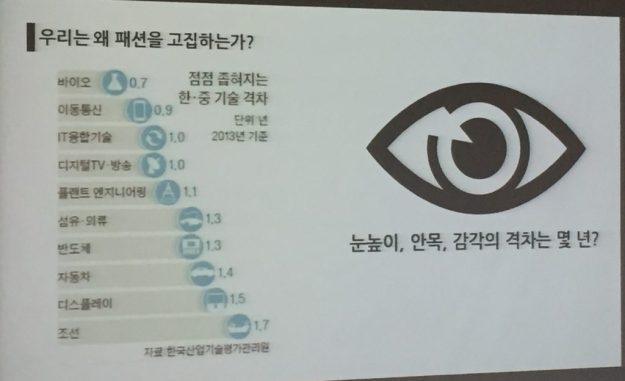왜 패션으로 창업을 했는가에 대해 이야기하며 보여준 아래의 슬라이드가 꽤 오래 기억에 남았다. 기술 발전과 다르게 ‘안목’은 한 번에 크는 것이 아니고 격차 추정이 어려운 분야가 바로 패션이라는 것. 굳이 패션 창업에 관심이 없더라도 아래 기술 격차의 감소는 여러모로 고민해 볼 주제다.