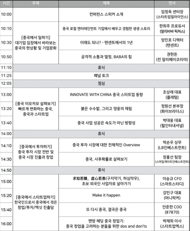 큰 주제는 온오프믹스에서 밝히고 있듯이 “중국에서 일하는 한국인들이 들려주는 보다 실질적이고 직접적인 이야기”다. 말 그대로 중국에 관심 있는 한국인들이 그들의 문화와 환경을 간접적으로 전해 듣고, 어떤 어려움을 겪으며 일을 하고 있는지, 실리콘밸리나 한국의 그것과 어떻게 다른지 각 분야 경험자들의 시각을 통해 전해주는 것이다. 아래와 같이 4개의 소주제로 7시간가량 진행되었다.