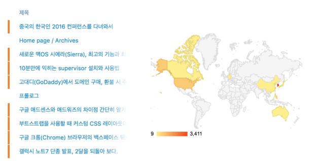 고무적인 것은 앞서 언급한 함정에서 빠져나오며 쓰기 시작한 글에 사람들이 (광고를 통해) 간접적으로 나마 지불한 비용을 받기 시작했다는 것이다. 이런 경험은 돈의 규모를 떠나 실로 놀라운 것이다. 아래는 한 해 동안 가장 많은 조회수를 기록한 글과 접속 지역에 대한 통계다. (<중국의 한국인 2016 콘퍼런스를 다녀와서>가 조회수 1위를 기록했는데 이건 온전히 임정욱 센터장님의 트윗 덕분이다.)