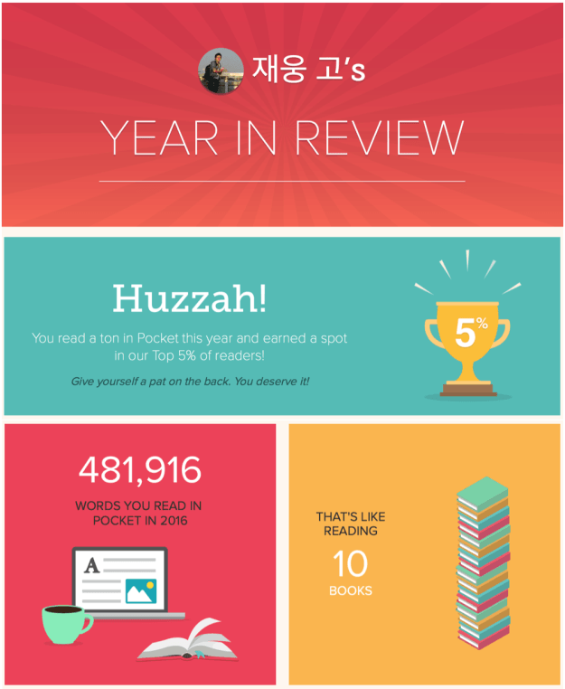 포켓(Pocket)을 통해서도 저장해둔 글을 읽었는데 얼마 전 포켓으로부터 아래와 같이 올해 10권 분량의 글을 읽었다는 메일이 왔다. 무려 상위 5%. 진짜인지 의 심부터 들지만 뭐 그냥 재미로.
