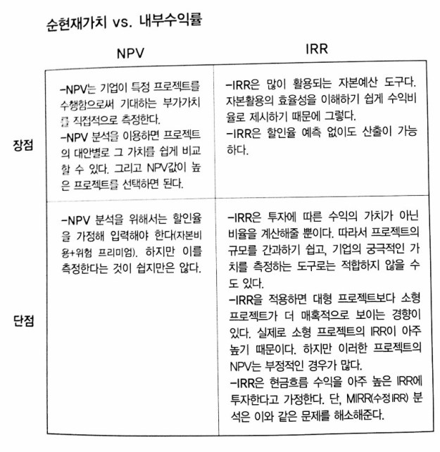 PV는 기업이 매래의 특정 시점에서 현금흐름을 비교할 때 사용한다. NPV는 기업이 특정 프로젝트를 통해 창출해낼 수 있는 부가가치를 측정하는 수치다.(기업의 부를 얼마나 증대시킬지) 일반적으로 NPV가 가장 높은 프로젝트를 선택해 진행한다. 미래에 얻게 될 현금가치에서 비용을 뺀 가치로, 현재의 명목화폐를 기준으로 한다. NPV의 값이 양수라면, 해당 프로젝트는 가치를 더해줄 것이다. NPV가 음수라면, 이 프로젝트를 진행해서는 안 된다.