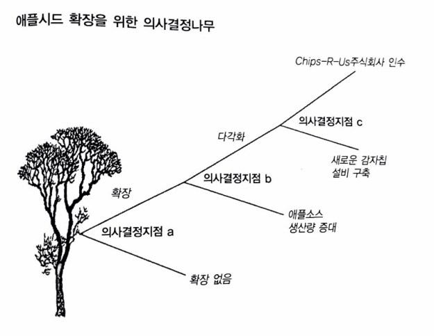 가지가 여럿 달린 나무를 닮았다 해서 붙여진 이름이다. 여기서 각각의 가지는 의사결정의 경로를 나타내고 사업 결정에 있어서 모든 주요 대안들을 나열해 볼 수 있다는 점에서 아주 유용한 도구다. 가지들을 그려나가면서 종착점에 도달하면 그만이다. 각 단계마다 대안들의 장점과 단점을 체계적으로 검토할 수 있도록 도와준다.