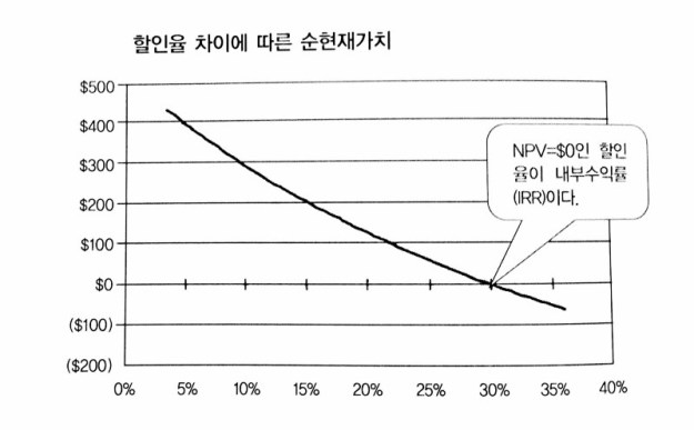 내부수익률(IRR)은 미래 현금흐름의 현재가치가 초기 투자비와 같은 값을 갖도록 만드는 할인 유이다. 따라서 IRR은 NPV=$0이 되는 지점이다.