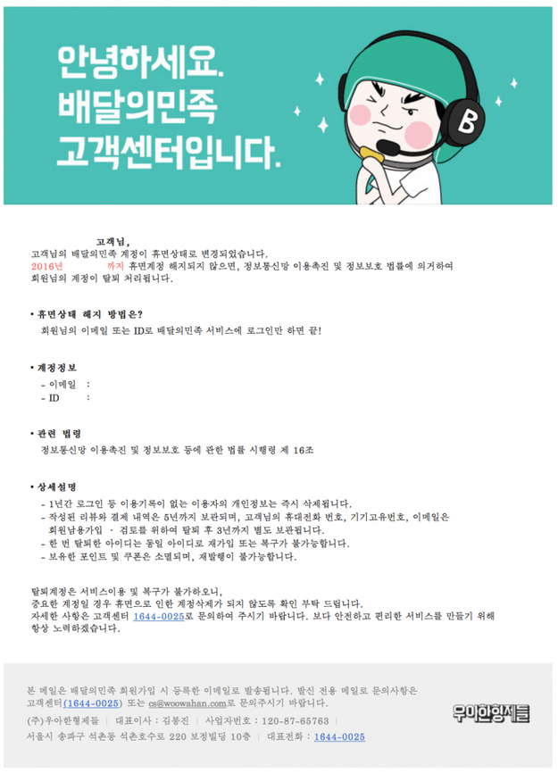 얼마 전 배달의 민족에서 계정이 휴면 상태로 변경될 예정이라는 메일을 받았다. 자주 시켜먹는 음식은 저장된 전화번호로 전화 거는 게 편하고, 새로운 장소나 메뉴를 찾을 때만 로그인 없이 쓰다 보니 이런 메일을 받게 된 것 같다. 휴면되지 않았으면 하는 마음에 로그인을 하려 했으나 링크가 없었고, 검색해서 들어간 사이트에서는 비밀번호가 맞지 않아서 계정 휴면 해지에 실패했다. 이 글은 배달의 민족 계정 휴면 해지 실패기다. : )