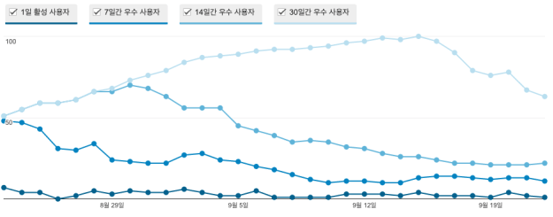 4개 구간으로 나눈 활성 사용자 관련 통계입니다. 30일간 우수 사용자가 지속적으로 증가하다가 최근 하락하기 시작했습니다. 이글을 보시는 분들 중에 아직 설치하지 않은 분이 있다면 얼른 설치하시고, 30일간 우수 사용자 숫자가 올라갈 수 있도록 도와주세요. ^^