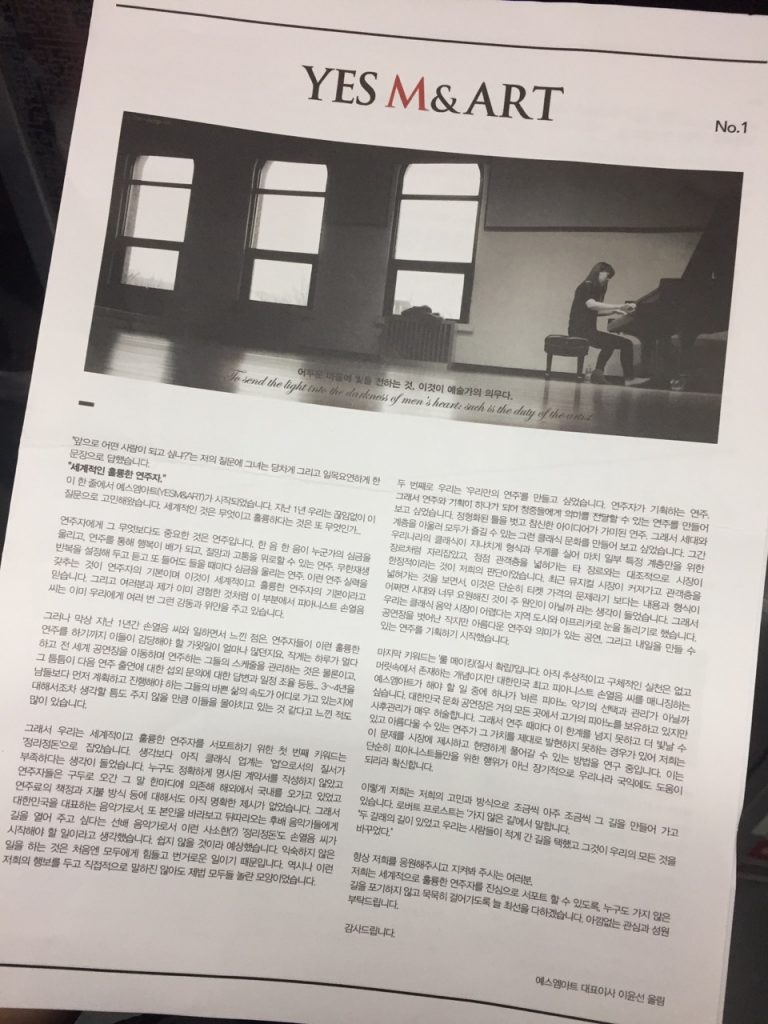 그런데 손열음 님의 그것보다 더 큰 감동을 주었고, 결국 이 글을 쓰기로 마음먹은 것은 따로 있습니다. 아래는 이번 손열음 씨의 Under the sea 앨범을 구매한 후 상자 안에 함께 담겨온 A4지 크기의 홍보 전단입니다. 예스엠아트 대표이사 이윤선 님의 인사 글과 인터뷰, 공연 소식에 대한 내용이 두어 페이지에 짧게 담겨 있습니다. 처음에는 대충 쓱 보고 버리려고 했습니다. 함께 딸려오는 종이가 다 그렇지 뭐 하는 생각 했으니까요. 그런데 한 문단 읽고, 또 한 문단을 읽고 결국 두어 번을 다시 읽고 잘 접어 가방에 넣었습니다. 마음을 흔드는 정돈된 글을 이렇게 만나다니.