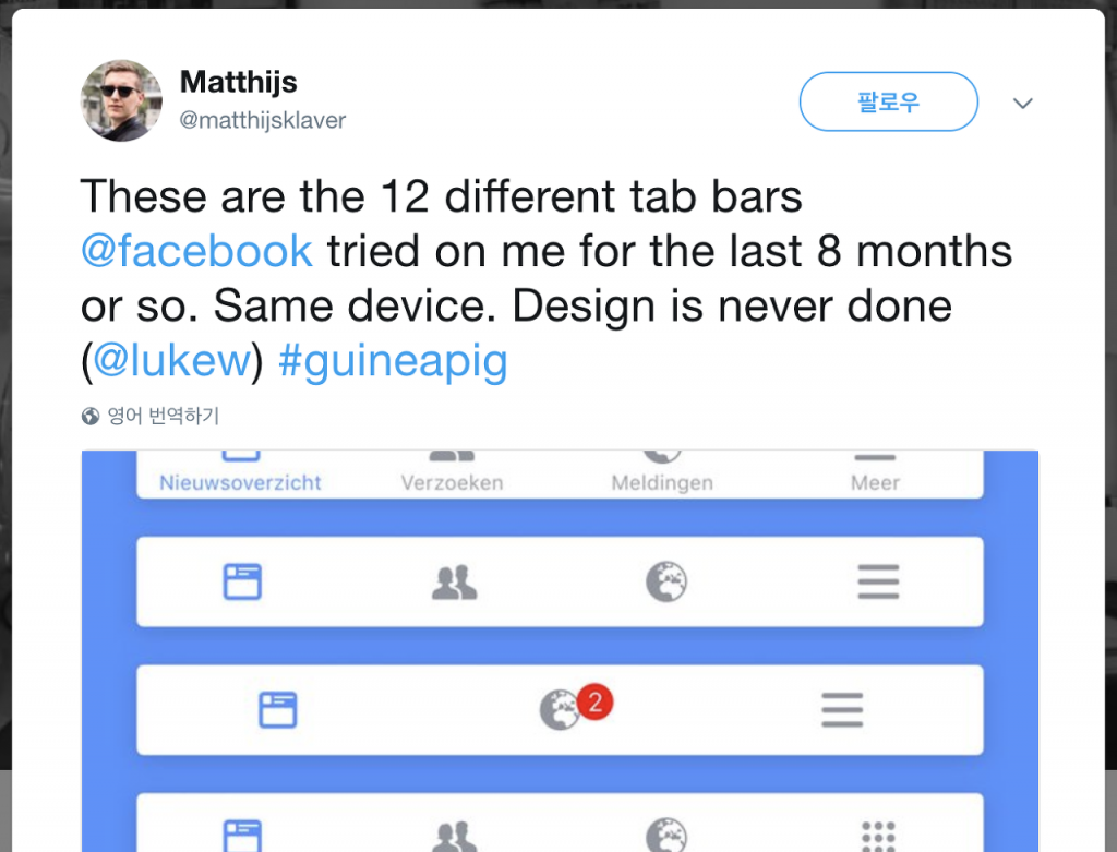 페이스북이 몇 달 동안 페이스북 앱의 하단의 탭바 메뉴(Tab bar, 앱 하단에 위치한 메뉴 버튼)를 계속 바꾸고 있다. 한 UI/UX 디자이너는 트위터를 통해 페이스북이 지난 8개월 동안 자신의 페이스북 앱에 테스트한 탭바를 모아 공개했다.
