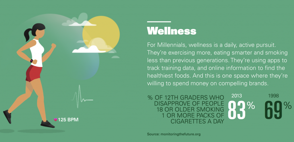 건강과 운동은 밀레니얼 세대를 특징하는 가장 중요한 요소 중 하나다. 이들이 생각하는 ‘건강’은 아프지 않은 것이 아니라 적극적으로 운동하고 좋은 음식을 먹고, 담배를 덜 피우고 온라인 서비스를 통해 건강 데이터를 기록하고 관리하는 것이다. 매력적인 브랜드에 돈을 쓰고 싶어하는 몇 안되는 분야인 것이다. 이런 건강에 대한 관심이 음식, 음료, 패션까지 이어진다.