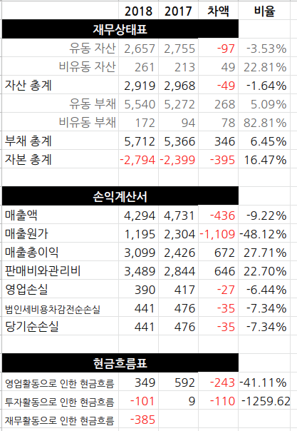 매출은 2018에 처음으로 꺾였고 당기순손익은 계속 손실이다. 부채는 계속 늘어나고 있고 자본도 계속 마이너스 증가하고 있다. 전자공시에 올라온 2018(제 9기) 재무제표다. 대체로 좋지 않지만 몇 가지 눈에 띄는 것은 –