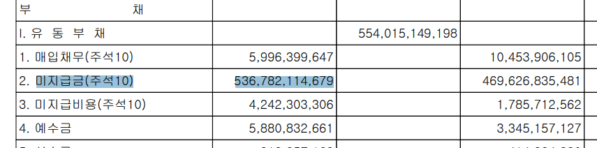 - 영업손실이 390억이지만 영업활동으로 인한 현금흐름이 플러스를 보이고 있다. (응?) 그러나 이 기사에서도 언급하고 있듯이 2018년 재무상태표를 살펴보면 유동부채 대부분이 미지급금이기 때문에 현금흐름이 좋게 보이는 착시를 만들었다.